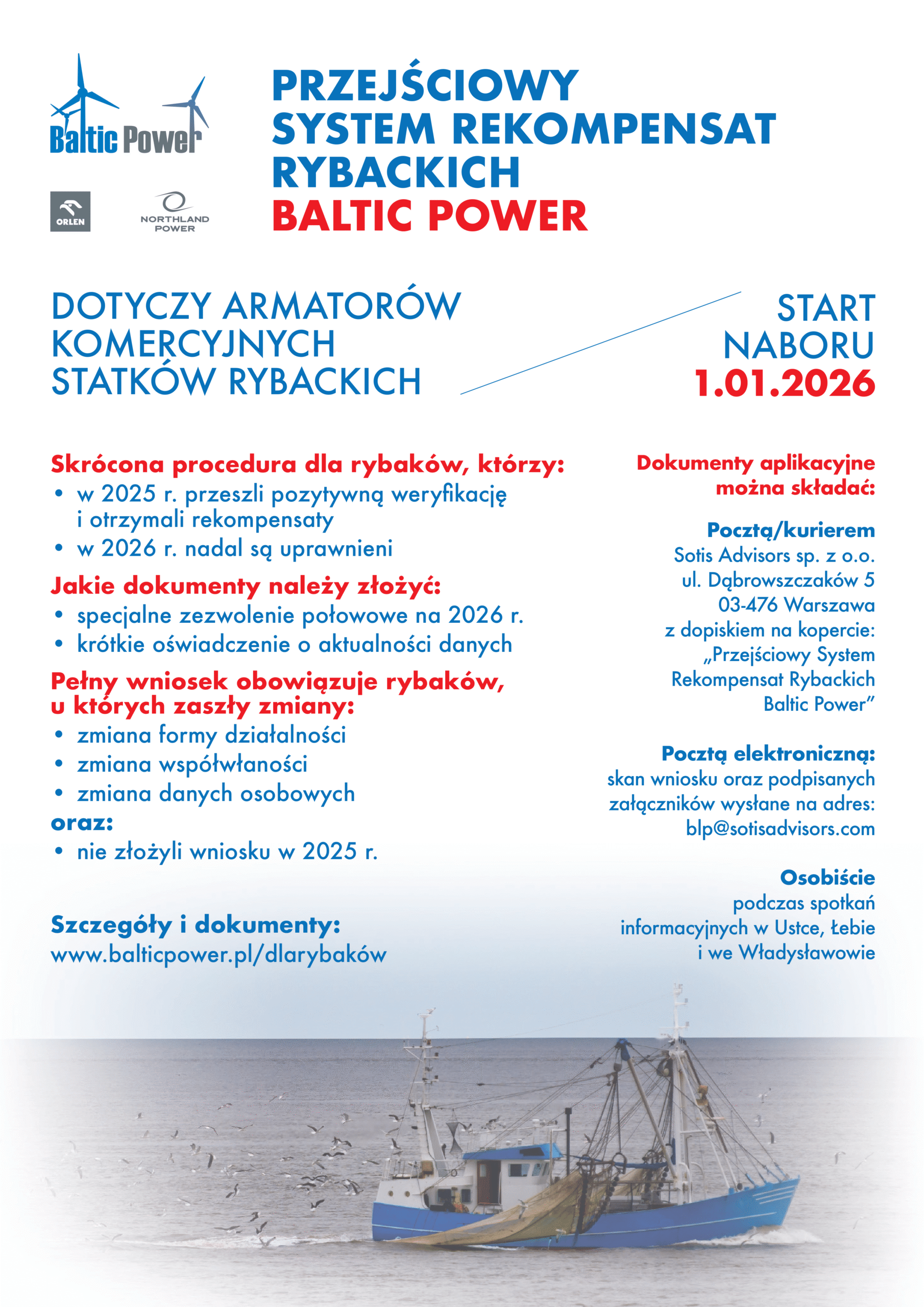 Program jest kontynuacją pierwszej rundy wypłat z 2025 roku – armatorzy, którzy już wcześniej uczestniczyli w programie, mogą skorzystać z uproszczonej procedury aplikacyjnej, ograniczonej do niezbędnego minimum formalności: https://balticpower.pl/aktualnosci/baltic-power-po-raz-drugi-rozpocznie-wyp%C5%82aty-rekompensat-dla-rybak%C3%B3w-w-ramach-przej%C5%9Bciowego-systemu-rekompensat/